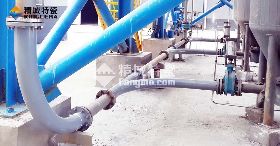 復(fù)合陶瓷管磨損嚴(yán)重的工況,而且部分已經(jīng)打了背包,經(jīng)研究發(fā)現(xiàn)復(fù)合陶瓷的微觀裂紋多,質(zhì)脆易碎,容易局部脫落失效,而且脫落后無法修補。后來結(jié)合我們老廠使用精城牌耐磨陶瓷管道的經(jīng)驗,采用氧化鋁陶瓷,氧化鋁陶瓷貼片的氧化鋁含量≥95%,而且全部是高溫相a-Al?O?,燒結(jié)溫度高達1670℃,確保材料的品質(zhì)。從以往耐磨陶瓷管道實際的磨損情況來看,內(nèi)襯耐磨陶瓷的管道使用壽命是離心澆筑復(fù)合陶瓷管的5倍以上。所以特邀請湖南精城特瓷的專家團隊到我司來現(xiàn)場勘察,解決輸灰管道易磨損的難題。