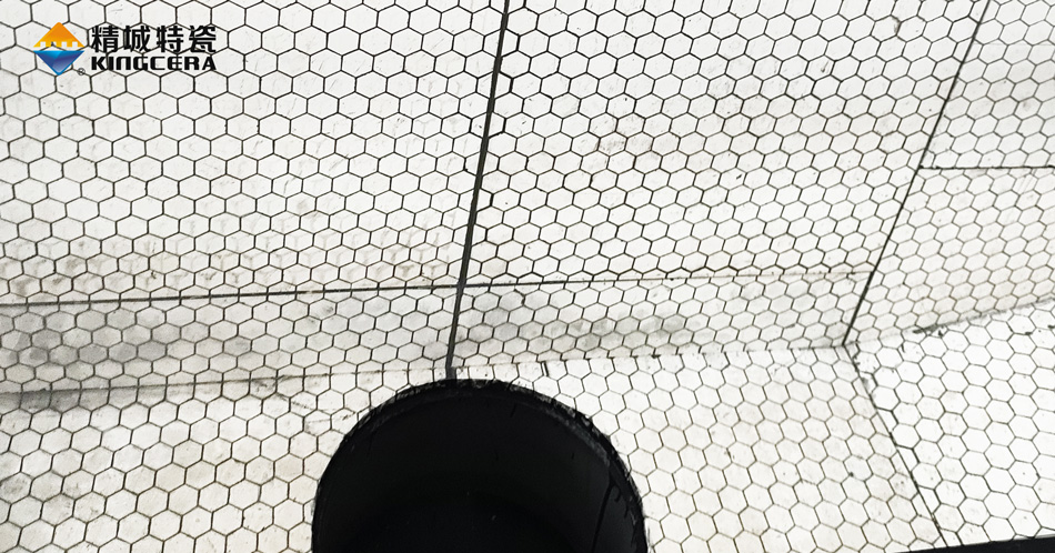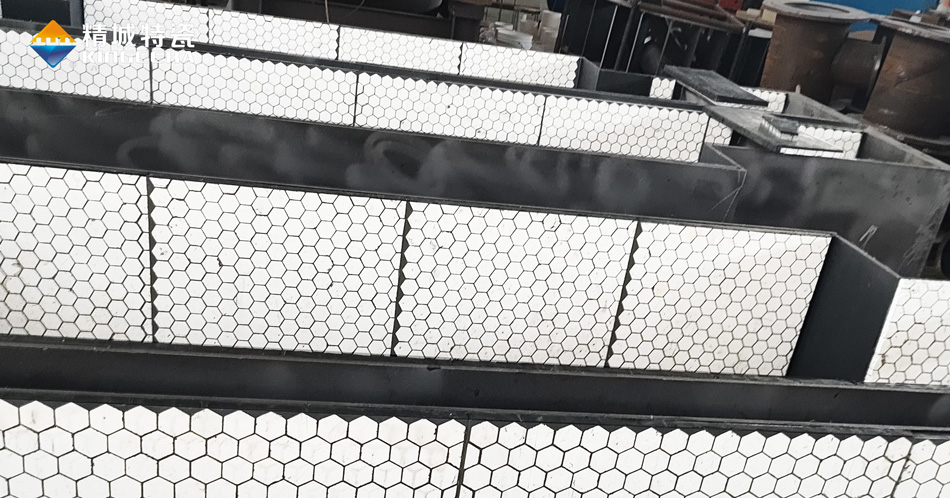 陶瓷襯板,非沖刷點(diǎn)使用95氧化鋁耐磨陶瓷,沖刷點(diǎn)使用ZTA耐磨陶瓷。不同陶瓷合理搭配可以讓溜槽的磨損程度基本一致,方便檢修更換。